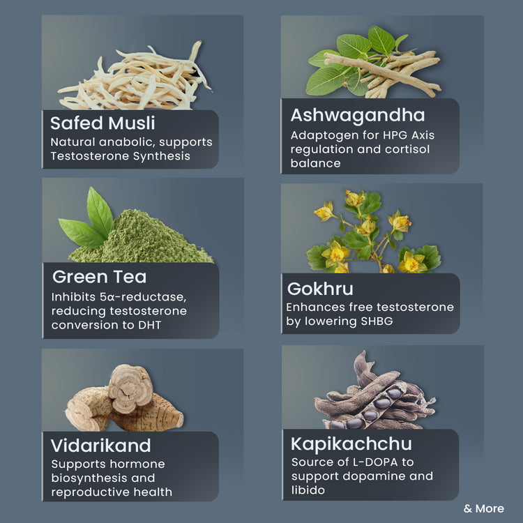 Ginger, Ginseng, and Jaiphal work to improve circulation, energy, and vitality, while Green Tea helps optimize free testosterone by reducing conversion to DHT and improving hormone availability.