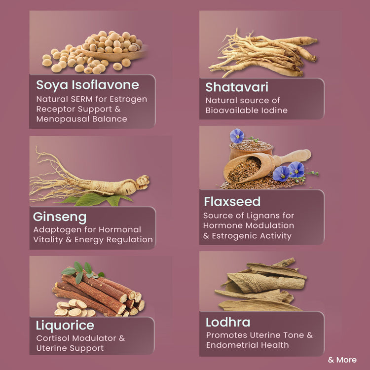 Phytoestrogens like soya isoflavones and flaxseed gently bind to estrogen receptors, helping balance highs and lows. Shatavari and Lodhra nourish ovarian function. Ginseng and Black Cohosh restore emotional balance. Liquorice and adaptogens help the body adapt to stress so that hormones can finally find their rhythm again.